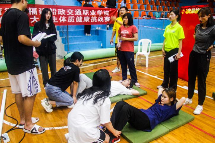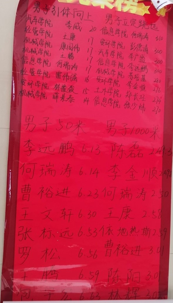 本次挑戰(zhàn)賽測試4個基礎(chǔ)體 能項目,男子組:引體向上、50米、立定跳遠、1000米。女子組:仰臥起坐、50米、立定跳遠、800米。各個學(xué)院積極響應(yīng),八個學(xué)院共派出95名精英參加本次比賽,本次比賽有三個環(huán)節(jié),第一環(huán)節(jié)是5月27日晚上測試的立定跳遠、女子仰臥起坐、男子引體向上。第二個環(huán)節(jié)是6月3日測試50米男子1000米、女子800米,第三個環(huán)節(jié)是6月9日的頒獎儀式。