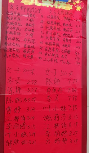 在比賽過程中,在檢錄階段,裁判員帶領(lǐng)同學(xué)們一起做準(zhǔn)備活動,充分的熱身運動保證學(xué)生不受傷的情況下賽出好成績,參賽運動員有序地的參加各項比賽,裁判員都是通識教育學(xué)院體育教研部的教師,認(rèn)真執(zhí)裁創(chuàng)造良好的比賽環(huán)境,同學(xué)在比賽時有精彩的表現(xiàn),現(xiàn)場都有歡呼聲和掌聲,運動員展現(xiàn)了良好的狀態(tài),給全院學(xué)生作出優(yōu)秀的榜樣,。在滿分60分的情況下,信息學(xué)院的何瑞濤以60.4分奪得男子總分冠軍,經(jīng)管學(xué)院肖愛丹55.5奪得女子總分冠軍,團體總分最終花落信息學(xué)院,其他具體成績詳見看光榮榜。