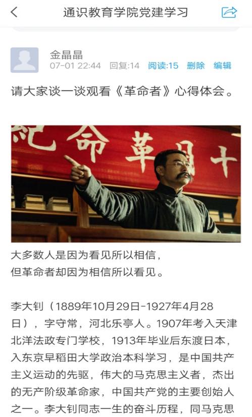 歷史川流不息,精神代代相傳。在觀影結(jié)束后各黨員通過(guò)“學(xué)習(xí)通”-“通識(shí)教育學(xué)院黨總支”-“討論”-“觀看黨建電影《革命者》,撰寫(xiě)心得體會(huì)”,通過(guò)觀看紅色電影《革命者》,師生黨員深刻感受到中國(guó)共產(chǎn)黨先驅(qū)們偉大的建黨精神,在奮斗中堅(jiān)持真理、堅(jiān)守理想,踐行初心、擔(dān)當(dāng)使命,不怕?tīng)奚⒂⒂露窢?zhēng),對(duì)黨忠誠(chéng)、不負(fù)人民,大家紛紛表示要繼續(xù)弘揚(yáng)光榮傳統(tǒng)、賡續(xù)紅色血脈,永遠(yuǎn)把偉大建黨精神繼承下去、發(fā)揚(yáng)光大。