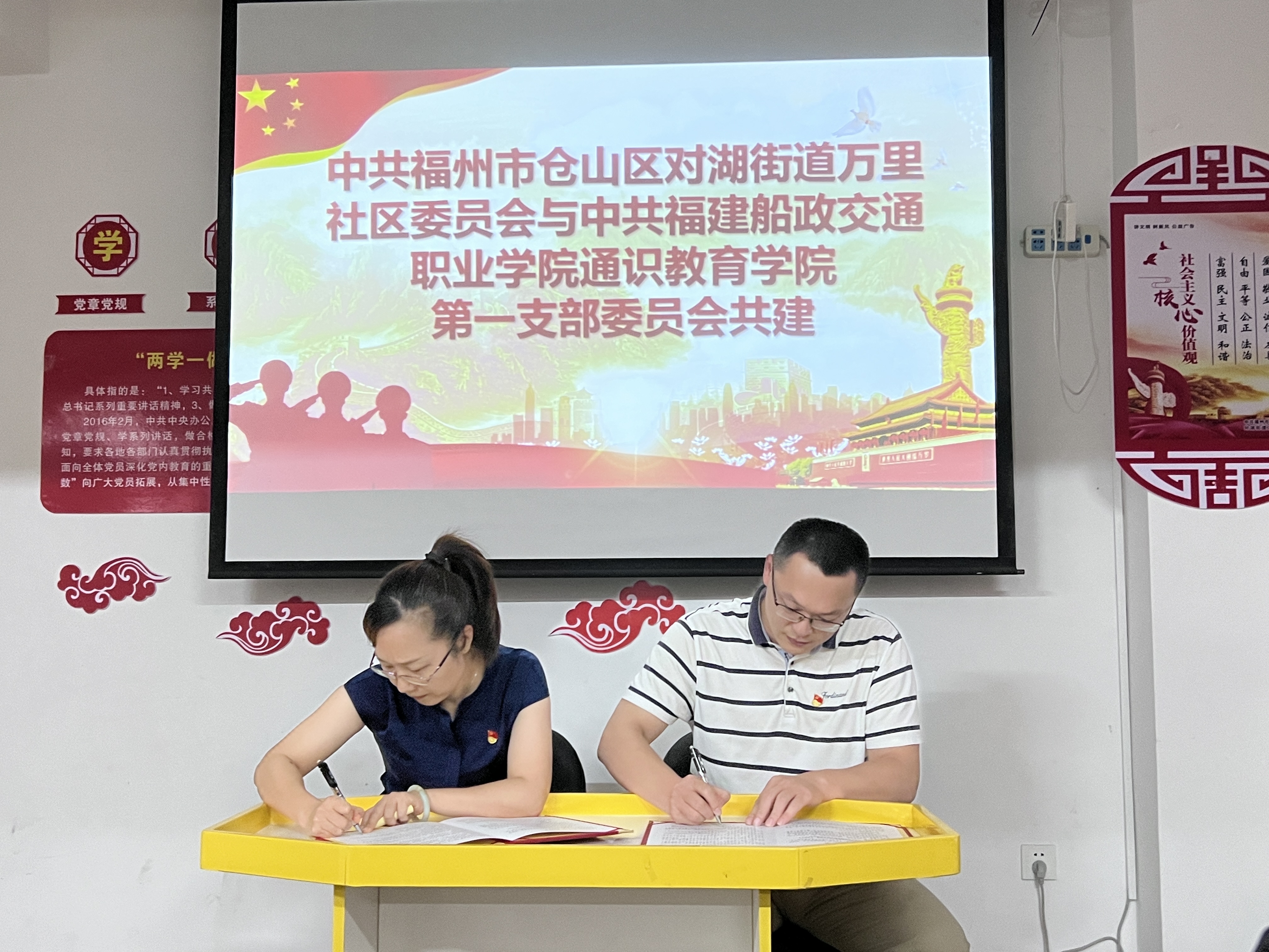 接著,雙方黨員重溫入黨誓詞,過“政治生日”,并開展《閩山閩水物華新--習(xí)近平福建足跡》等系列教材交流。雙方交流會上,倉山區(qū)萬里社區(qū)主任林玉梅回顧黨的百年光輝歷程,要求社區(qū)黨員要深入學(xué)習(xí)習(xí)近平新時代中國特色社會主義思想,以更加奮發(fā)有為的精神狀態(tài)和求真務(wù)實(shí)的工作作風(fēng)做好社區(qū)工作。通識教育學(xué)院黨總支副書記金晶晶要求總支黨員們要結(jié)合省委部署的“提高效率、提升效能、提增效益”行動,示范帶動,以“馬上就辦、真抓實(shí)干”的工作作風(fēng),抓緊每一天、干好每一月,奮力推動各項工作提速增效。最后,雙方黨員合唱《沒有共產(chǎn)黨就沒有新中國》。會后,通識教育學(xué)院第一黨支部書記沈焰焰與倉山萬里社區(qū)黨委簽訂黨建共建協(xié)議,建立黨員共育、活動共聯(lián)、資源共享的黨建共建機(jī)制。