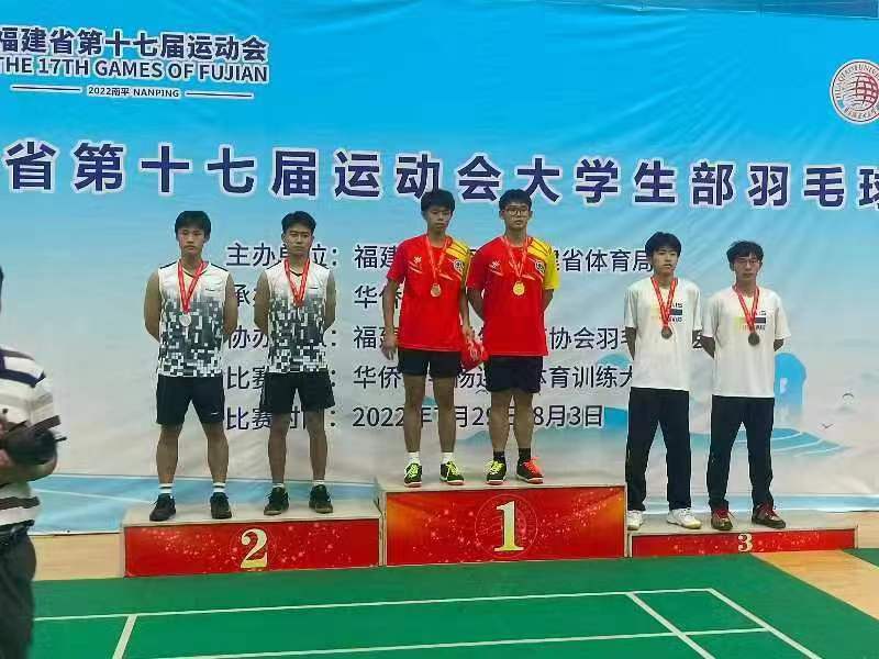 2022年7月27日-8月3日,福建省第十七屆運動會(大學(xué)生部)羽毛球比賽在華僑大學(xué)泉州校區(qū)開賽,來自全省43所高校的353名運動員參賽。本次比賽包括男子單打、男子雙打、女子單打、女子雙打、男子團(tuán)體、女子團(tuán)體6個項目,我院羽毛球代表隊榮獲福建省第十七屆運動會(大學(xué)生部)羽毛球比賽丙組團(tuán)體總積分第一名的優(yōu)異成績,并獲得“體育道德風(fēng)尚獎運動隊”榮譽稱號,運動員蔣賢智、楊舒淇獲個人“體育道德風(fēng)尚獎”,王姍姍老師獲“優(yōu)秀教練員”榮譽稱號。