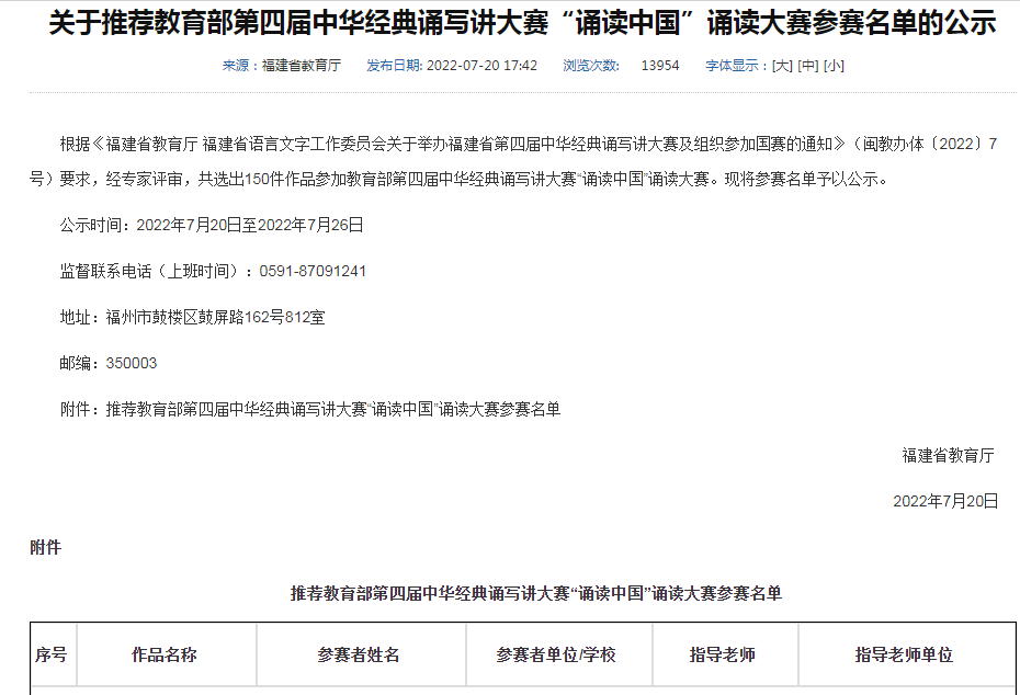 2022年7月8日,由我院教師于曉凌、吳婷婷、劉昉昉、邱晶晶指導(dǎo)參賽的兩份作品《永遠(yuǎn)的致遠(yuǎn)艦》和《相信》參加了福建省第四屆中華經(jīng)典誦寫講大賽現(xiàn)場決賽,場上參賽選手雄姿英發(fā)、從容應(yīng)賽。其中《永遠(yuǎn)的致遠(yuǎn)艦》以優(yōu)秀的成績作為福建省代表作品入圍國賽。