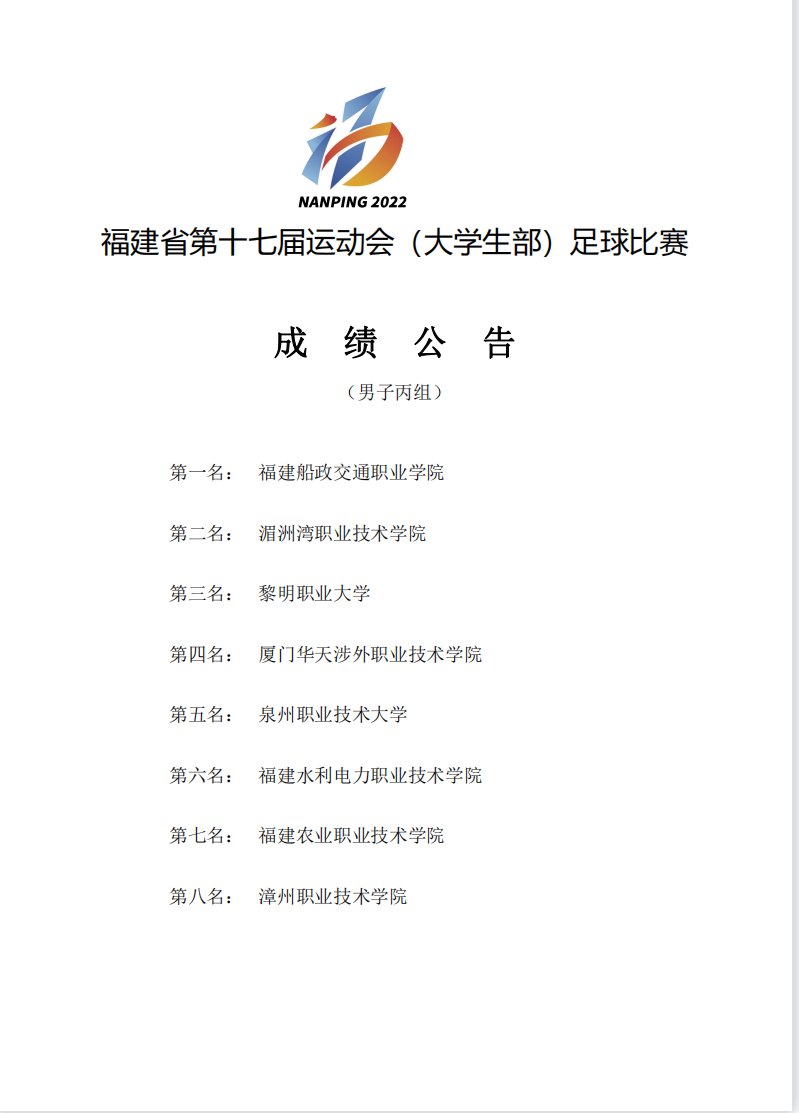 該組別共有全省10個高職院校代表隊參賽。比賽中,各代表隊充分發(fā)揚敢打敢拼、頑強拼搏的作風,尊重裁判、尊重對手,展現(xiàn)出我省大學生銳意進取、奮發(fā)圖強的精神風貌。經(jīng)過為期6天的激烈比拼,決出本次比賽前八名名次,我校男子足球隊斬獲第一名的好成績。