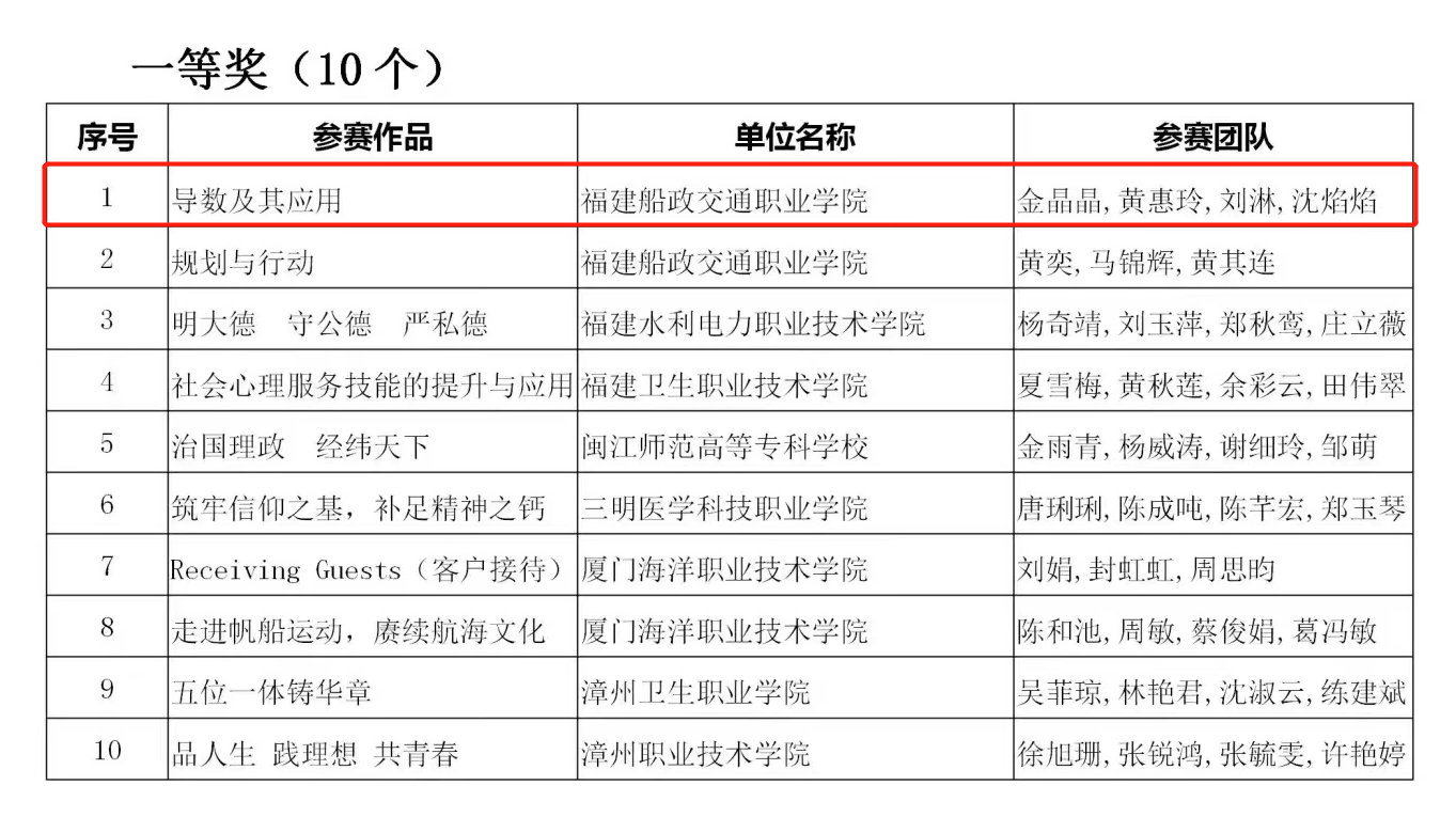 日前,省教育廳公布了2022年福建省職業(yè)院校技能大賽教學(xué)能力比賽獲獎名單,我院數(shù)學(xué)教學(xué)參賽隊(金晶晶、劉淋、沈焰焰、黃惠玲)的《導(dǎo)數(shù)及其應(yīng)用》作品榮獲一等獎。