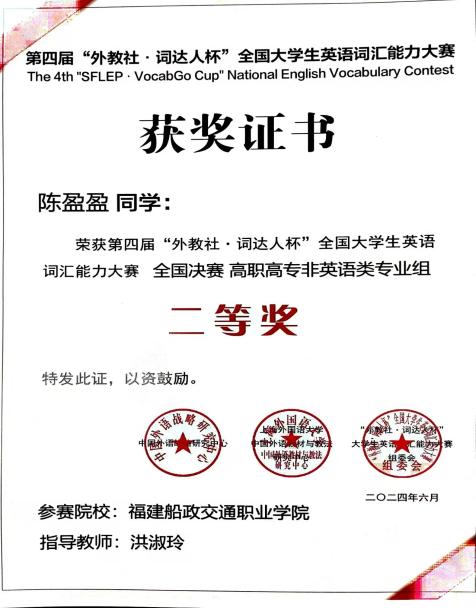 中國(guó)外語(yǔ)戰(zhàn)略研究中心、中國(guó)外語(yǔ)教材與教法研究中心和上海外語(yǔ)教育出版社于2024年3月-5月聯(lián)合啟動(dòng)了第四屆“外教社·詞達(dá)人杯”全國(guó)大學(xué)生英語(yǔ)詞匯能力大賽。我校共有547名選手報(bào)名參賽,其中54位選手晉級(jí)省賽。其中,4月16日舉行的省賽中。我校4位選手分別獲得省一、二、三等獎(jiǎng),潘崇宇和陳瑩瑩同學(xué)代表我校參加了5月25日舉行的全國(guó)總決賽并分別獲得全國(guó)決賽一、二等獎(jiǎng)。