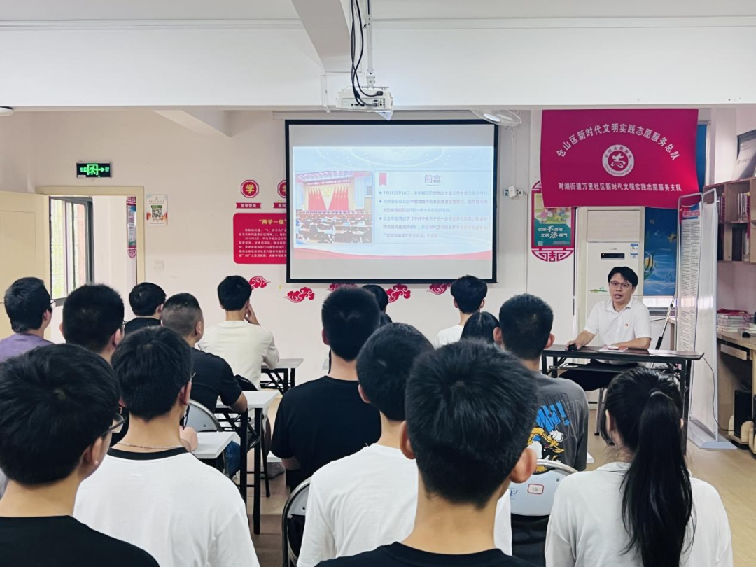 在社區(qū)黨員活動室,通識教育學(xué)院黨總支副書記金晶晶進(jìn)行學(xué)習(xí)貫徹黨的二十屆三中全會精神宣講,從深刻認(rèn)識黨的二十屆三中全會的重大意義、深入學(xué)習(xí)領(lǐng)會習(xí)近平總書記在全會上的重要講話精神、全面準(zhǔn)確理解《中共中央關(guān)于進(jìn)一步全面深化改革、推進(jìn)中國式現(xiàn)代化的決定》提出的重大舉措、貫徹落實會議精神等方面進(jìn)行闡釋輔導(dǎo)。會上,師生與社區(qū)工作人員圍繞深入學(xué)習(xí)貫徹黨的二十屆三中全會精神開展學(xué)習(xí)交流,現(xiàn)場氣氛熱烈。