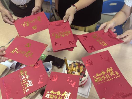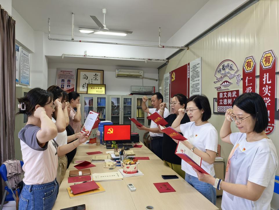 活動伊始,支部書記為黨員教師贈送“政治生日賀卡”。賀卡印刻入黨誓詞與黨員入黨日期,傳遞組織關懷與責任囑托。接著,黨員教師面對黨旗重溫宣誓,鏗鏘誓言響徹會場。隨后,支部通過活動深化黨員身份認同,現(xiàn)場洋溢著“組織溫情”與“紅色力量”的交融共鳴。