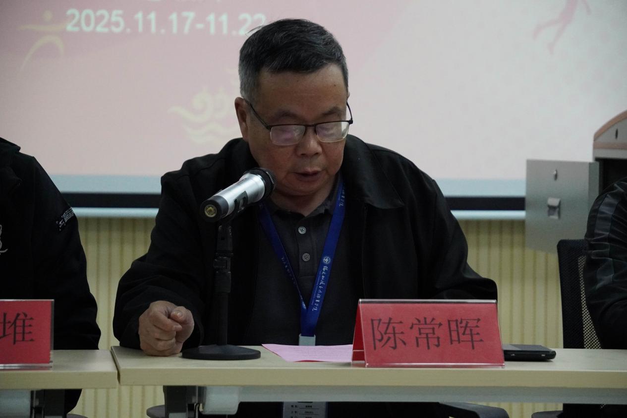 第一階段議程中,陳常暉副院長(zhǎng)代表學(xué)校致歡迎辭,對(duì)與會(huì)領(lǐng)導(dǎo)、嘉賓及各參賽隊(duì)伍表示熱烈歡迎。他介紹了我校作為國(guó)家示范性高職院校和“雙高計(jì)劃”建設(shè)單位的辦學(xué)成果,并介紹了我校“以體育德、以賽育人、專(zhuān)技相長(zhǎng)”的體育育人理念,致力于將體育精神融入人才培養(yǎng)全過(guò)程。陳副院長(zhǎng)表示,學(xué)校高度重視本次賽事協(xié)辦工作,已組建專(zhuān)項(xiàng)工作組,全面做好場(chǎng)地維護(hù)、后勤保障與安全服務(wù),全力營(yíng)造公平、安全、舒適的競(jìng)賽環(huán)境。他期待各參賽隊(duì)伍恪守體育道德,尊重規(guī)則、尊重對(duì)手、尊重裁判,展現(xiàn)當(dāng)代大學(xué)生的良好精神風(fēng)貌。