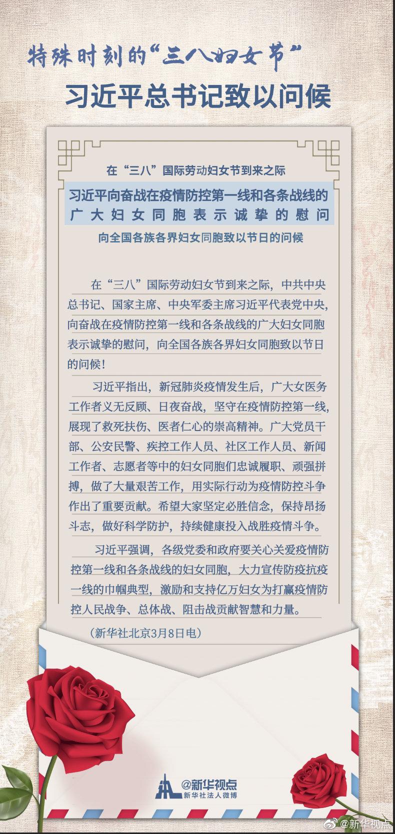 習(xí)近平指出,新冠肺炎疫情發(fā)生后,廣大女醫(yī)務(wù)工作者義無反顧、日夜奮戰(zhàn),堅(jiān)守在疫情防控第一線,展現(xiàn)了救死扶傷、醫(yī)者仁心的崇高精神。廣大黨員干部、公安民警、疾控工作人員、社區(qū)工作人員、新聞工作者、志愿者等中的婦女同胞們忠誠履職、頑強(qiáng)拼搏,做了大量艱苦工作,用實(shí)際行動為疫情防控斗爭作出了重要貢獻(xiàn)。希望大家堅(jiān)定必勝信念,保持昂揚(yáng)斗志,做好科學(xué)防護(hù),持續(xù)健康投入戰(zhàn)勝疫情斗爭。