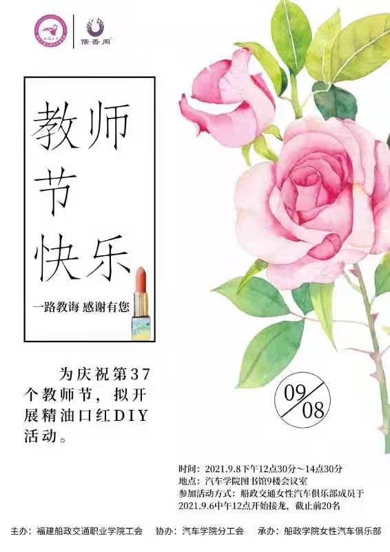 為慶祝第37個(gè)教師節(jié),福建船政交通職業(yè)學(xué)院工會(huì)主辦,汽車學(xué)院分工會(huì)協(xié)辦,船政學(xué)院女性汽車俱樂部承辦擬于9月8日下午12點(diǎn)30分工會(huì)在汽車學(xué)院(圖書館9樓)開展精油口紅DIY活動(dòng)。名額僅限20名,歡迎大家踴躍報(bào)名。