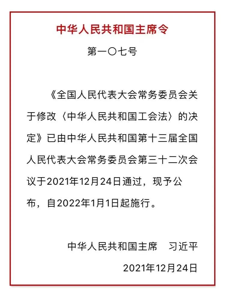 (1992年4月3日第七屆全國人民代表大會第五次會議通過 根據(jù)2001年10月27日第九屆全國人民代表大會常務(wù)委員會第二十四次會議《關(guān)于修改〈中華人民共和國工會法〉的決定》第一次修正 根據(jù)2009年8月27日第十一屆全國人民代表大會常務(wù)委員會第十次會議《關(guān)于修改部分法律的決定》第二次修正 根據(jù)2021年12月24日第十三屆全國人民代表大會常務(wù)委員會第三十二次會議《關(guān)于修改〈中華人民共和國工會法〉的決定》第三次修正)