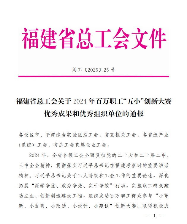 近日,福建省總工會發(fā)布《關(guān)于2024年百萬職工“五小”創(chuàng)新大賽優(yōu)秀成果和優(yōu)秀組織單位的通報》,我院鄒澤昌省級勞模工匠創(chuàng)新工作室報送的創(chuàng)新成果表現(xiàn)優(yōu)異,共斬獲一等獎1項、二等獎1項、三等獎2項。