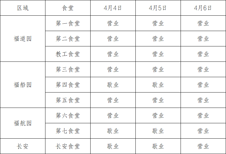 清明節(jié)假期各食堂開餐歇業(yè)表