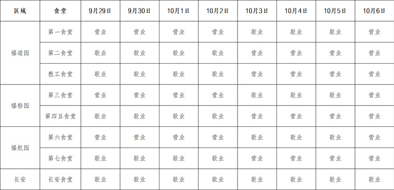 中秋國(guó)慶節(jié)假期各食堂開(kāi)餐歇業(yè)表