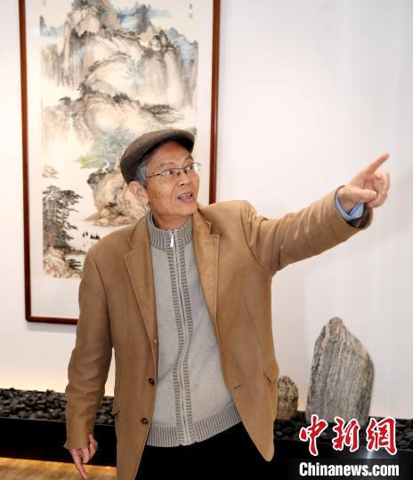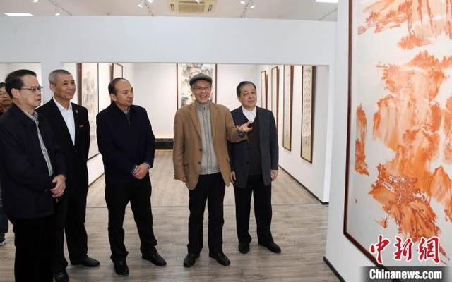著名藝術(shù)家沈巖先生(右二)向來賓介紹在館內(nèi)展出、由他本人創(chuàng)作的80多幅書畫作品。