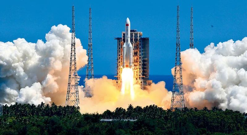 搭載問天實驗艙的長征五號B遙三運載火箭,在我國文昌航天發(fā)射場點火發(fā)射(2022年7月24日攝) 李剛攝