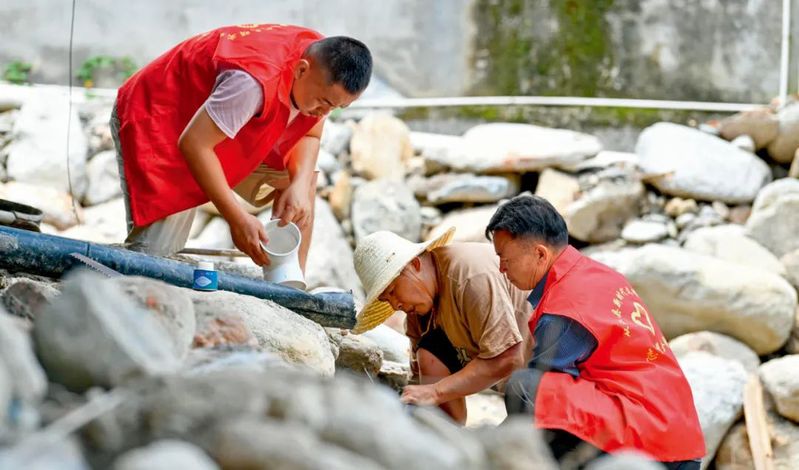 在貴州省從江縣剛邊壯族鄉(xiāng)銀平村,黨員志愿者幫助受災村民修整水管(2022年7月1日攝) 楊文斌攝
