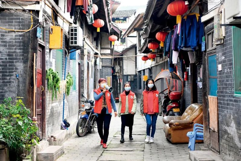 位于重慶南部的綦江區(qū)東溪鎮(zhèn)二居社區(qū)居委會主任李明素(左)與志愿者在古鎮(zhèn)老街上巡邏(2020年3月5日攝) 唐奕攝