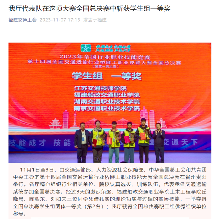 媒體聚焦 | 福建交通工會(huì)報(bào)道我院這項(xiàng)大賽全國總決賽獲獎(jiǎng)情況