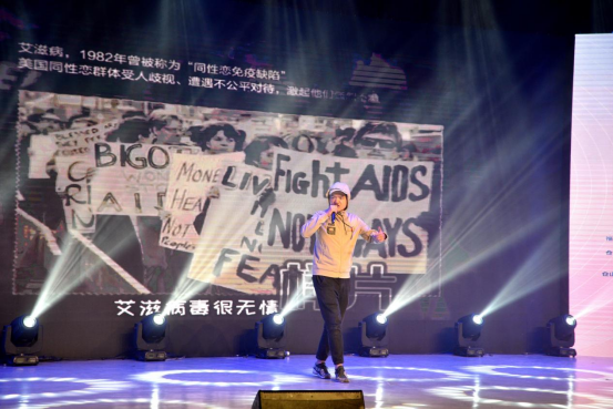 福州本土主持人土豆,與他的妻子豆嫂帶來(lái)了歌曲《與艾揮揮手》,淺顯易懂的歌詞,提高大家艾滋病的自我防范意識(shí)。
