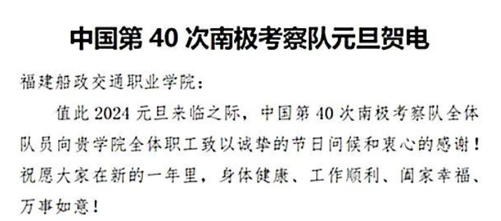 近日,福建船政交通職業(yè)學(xué)院收到中國第40次南極科學(xué)考察隊發(fā)來的元旦賀電,向福建船政交通職業(yè)學(xué)院對極地事業(yè)的長期支持和大力關(guān)心表示衷心的感謝。
