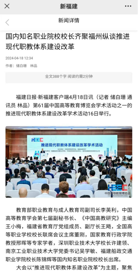 中國教育報(bào)-中國教育新聞網(wǎng)訊(記者 龍超凡 通訊員 林品 肖晨)4月16日,由中國高等教育學(xué)會、福建省教育廳主辦,福建船政交通職業(yè)學(xué)院、中國高等教育培訓(xùn)中心、國藥勵展展覽有限責(zé)任公司承辦第61屆中國高等教育博覽會推進(jìn)現(xiàn)代職教體系建設(shè)改革學(xué)術(shù)活動在福建福州召開。