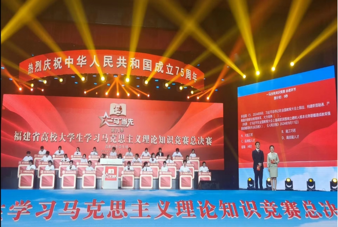 為熱烈慶祝中華人民共和國成立75周年,堅持不懈用習(xí)近平新時代中國特色社會主義思想鑄魂育人,引導(dǎo)青年學(xué)生立報國強國大志向、做挺膺擔(dān)當(dāng)奮斗者,9月27日,由中共福建省委教育工委主辦,福建省高校思想政治理論課教學(xué)指導(dǎo)委員會、福建教育電視臺承辦的第九季福建省高校大學(xué)生學(xué)習(xí)馬克思主義理論“一‘馬’當(dāng)先”知識競賽總決賽在福州大學(xué)旗山校區(qū)落下帷幕。我院黨委書記陳宜大攜師生代表參與活動觀摩。