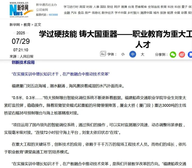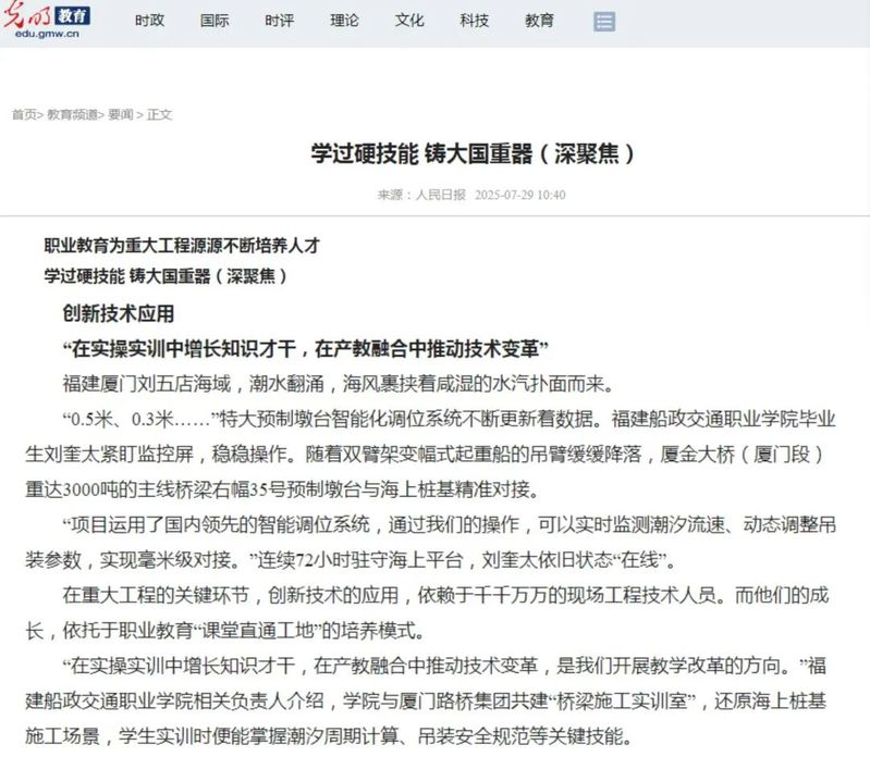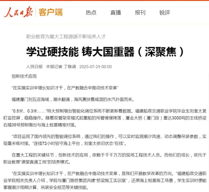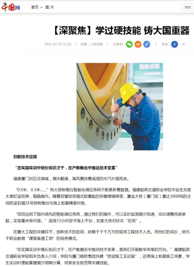 7月29日,人民網(wǎng)、新華網(wǎng)、光明網(wǎng)、中國(guó)網(wǎng)等中央主流媒體報(bào)道我院畢業(yè)生劉奎太參與廈金大橋(廈門段)建設(shè),展現(xiàn)學(xué)院在產(chǎn)教融合育人方面所取得的顯著成效。具體報(bào)道情況如下: