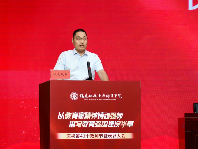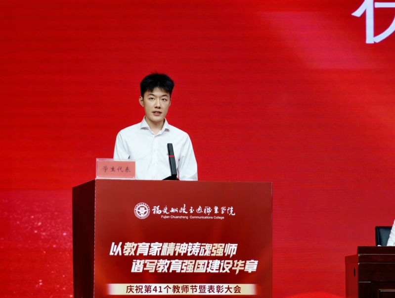 來自安全與環(huán)境學(xué)院24級安全技術(shù)與管理專業(yè)的劉濱福同學(xué),作為學(xué)生代表為全體教師送上真摯祝福,他分享了自己從軍旅到重返校園的心路歷程,感謝老師們的悉心教導(dǎo),并表示將以更加堅定的信念和實際行動回報師恩、不負(fù)青春。