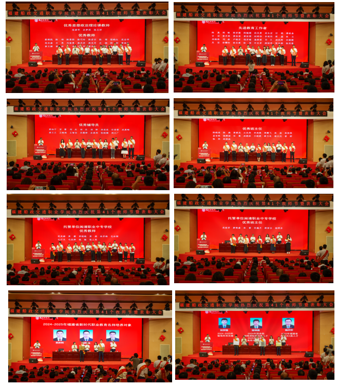 會議在莊嚴(yán)的國歌聲中拉開序幕。大會對2024-2025學(xué)年獲得學(xué)院優(yōu)秀教師、先進(jìn)教育工作者、優(yōu)秀輔導(dǎo)員、優(yōu)秀班主任,福建閩清職業(yè)中專學(xué)校優(yōu)秀教師和優(yōu)秀班主任,享受政府特殊津貼高技能人才、福建省高層次人才、極地科考先鋒,福建省教學(xué)成果獎特等獎、一等獎,世界職業(yè)院校技能大賽金獎指導(dǎo)教師,第二批國家級教師教學(xué)創(chuàng)新團(tuán)隊,全國樣板支部、全國“雙帶頭人”教師黨支部書記“強國行”專項團(tuán)隊,全國模范職工之家、福建省勞模工匠創(chuàng)新工作室、福建省工匠學(xué)院的個人和團(tuán)隊代表進(jìn)行頒獎。