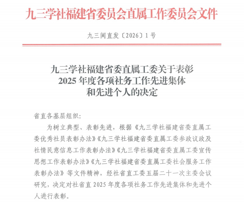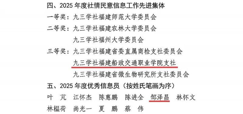 近日,九三學(xué)社福建省委員會直屬工作委員會表彰2025年度各項(xiàng)社務(wù)工作先進(jìn)集體和先進(jìn)個人,九三學(xué)社福建船政交通職業(yè)學(xué)院支社委員會榮獲2025年度社情民意信息工作先進(jìn)集體三等獎,支社主委鄒澤昌榮獲2025年度優(yōu)秀信息員和社會服務(wù)工作先進(jìn)個人。