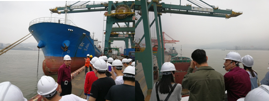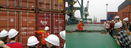 陳宏主任利用正在裝卸的集裝箱船,對(duì)同學(xué)們進(jìn)行現(xiàn)場(chǎng)教學(xué),講解船舶的基本知識(shí),如船舶構(gòu)造和船身標(biāo)識(shí)等,加深同學(xué)們對(duì)課堂知識(shí)的認(rèn)識(shí)和理解。在現(xiàn)場(chǎng)教學(xué)的過(guò)程中,陳宏主任還與同學(xué)們進(jìn)行了現(xiàn)場(chǎng)互動(dòng),對(duì)學(xué)生進(jìn)行提問(wèn),考查課堂學(xué)習(xí)的效果