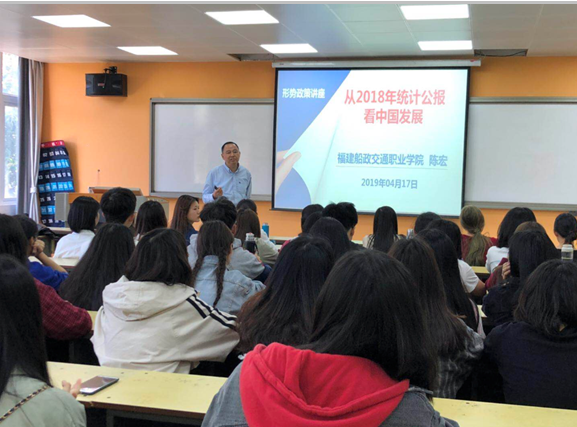 為貫徹落實(shí)《中共福建省委教育工委關(guān)于進(jìn)一步規(guī)范高校形勢(shì)與政策課教育教學(xué)工作的通知》(閩委教思〔2017〕13 號(hào))指出,“高校黨委書(shū)記、校長(zhǎng)和院(系)黨組織書(shū)記、院長(zhǎng)(系主任)每學(xué)期至少為學(xué)生作一次形勢(shì)政策報(bào)告”。根據(jù)《教社科廳函〔2019〕9號(hào)教育部辦公廳關(guān)于印發(fā)<高校“形勢(shì)與政策”課教學(xué)要點(diǎn)(2019年上輯)>的通知》,交通經(jīng)濟(jì)系主任于2019年4月17日15:50在31#307教室為交通經(jīng)濟(jì)系會(huì)計(jì)專業(yè)學(xué)生做了一場(chǎng)題為“從2018年統(tǒng)計(jì)公報(bào)看中國(guó)發(fā)展”的主題報(bào)告。報(bào)告上陳宏主任從十九大報(bào)告不忘初心,牢記使命,高舉中國(guó)特色社會(huì)主義偉大旗幟,決勝全面建成小康社會(huì),奪取新時(shí)代中國(guó)特色社會(huì)主義偉大勝利,為實(shí)現(xiàn)中華民族偉大復(fù)興的中國(guó)夢(mèng)不懈奮斗。中國(guó)共產(chǎn)黨人的初心和使命,就是為中國(guó)人民謀幸福,為中華民族謀復(fù)興。