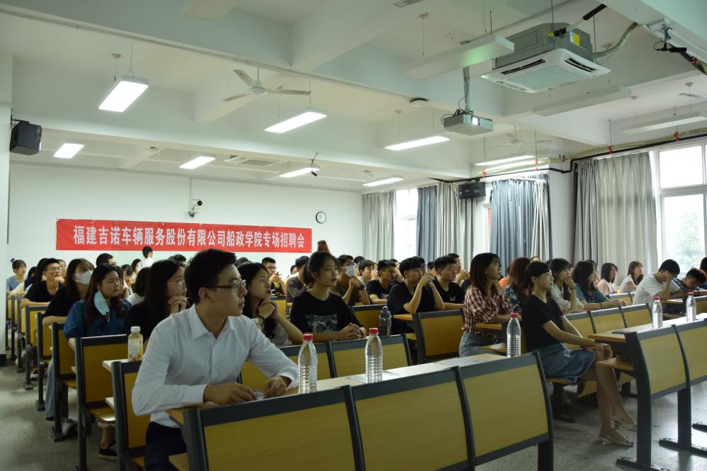 為切實做好應屆畢業(yè)生就業(yè)工作的穩(wěn)步推進,拓寬校企合作渠道,2020年9月12日上午經(jīng)濟與管理學院與福建吉諾車輛服務股份有限公司在福建船政交通職業(yè)學院31號樓308教室共同舉辦秋季校園專場宣講會。經(jīng)濟與管理學院院長房曰榮、經(jīng)濟與管理學院副院長林穎、吉諾公司客服部總監(jiān)劉偉彪、吉諾股份董事會秘書賴道菊,以及2021屆市場營銷專業(yè)和電子商務專業(yè)100余名畢業(yè)生共同出席本次宣講會。