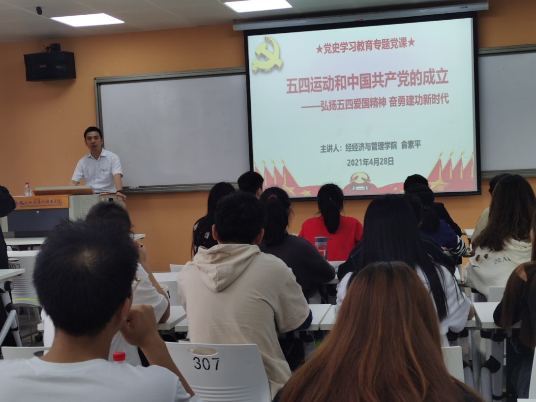 為持續(xù)深入推進(jìn)黨史學(xué)習(xí)教育和“再學(xué)習(xí)、再調(diào)研、再落實(shí)”活動(dòng),4月29日下午,經(jīng)濟(jì)與管理學(xué)院黨總支俞素平書(shū)記在南區(qū)31號(hào)樓307教室作題為“弘揚(yáng)五四愛(ài)國(guó)精神 奮勇建功新時(shí)代”的黨史學(xué)習(xí)教育專(zhuān)題黨課。學(xué)院全體輔導(dǎo)員和學(xué)生黨員發(fā)展對(duì)象參加了此次黨史學(xué)習(xí)講座。