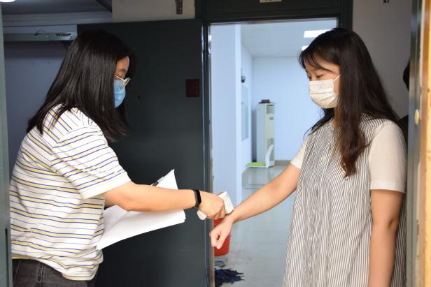上課之前,班長進(jìn)行登記同學(xué)的體溫,每位同學(xué)之間間隔一米