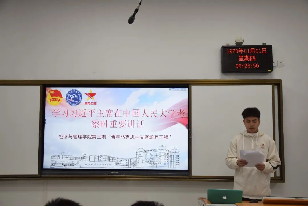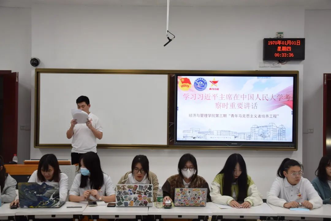 為深入學習貫徹習近平總書記系列重要講話精神,落實“青年馬克思主義者培養(yǎng)工程”要求,大力推進我院共青團的任務,努力培養(yǎng)一批有理想、有道德、有文化、有紀律的骨干人才,2022年4月30日——5月2日,經(jīng)濟與管理學院舉行了第三期“青年馬克思主義者培養(yǎng)工程”暨“團學干部儲備班”。參加本次開班儀式的有校團委書記陳慧、經(jīng)濟與管理學院團委書記傅一丹、青馬班班主任謝鑫以及本期青馬班全體成員。