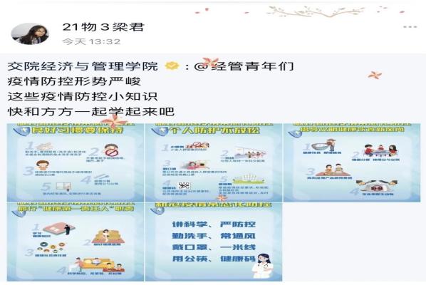 線上、線下進(jìn)行防疫宣傳。突擊隊(duì)隊(duì)員們深入學(xué)生宿舍,與寢同學(xué)們親切地交談,叮囑他們?cè)谛?nèi)要做好疫情防護(hù)工作,并積極配合學(xué)校和學(xué)院的防疫工作,為疫情防控工作貢獻(xiàn)自己的一份力量。同時(shí)隊(duì)員們還利用QQ、微信等平臺(tái)傳播疫情防護(hù)小知識(shí)引導(dǎo)同學(xué)們科學(xué)理性看待疫情。