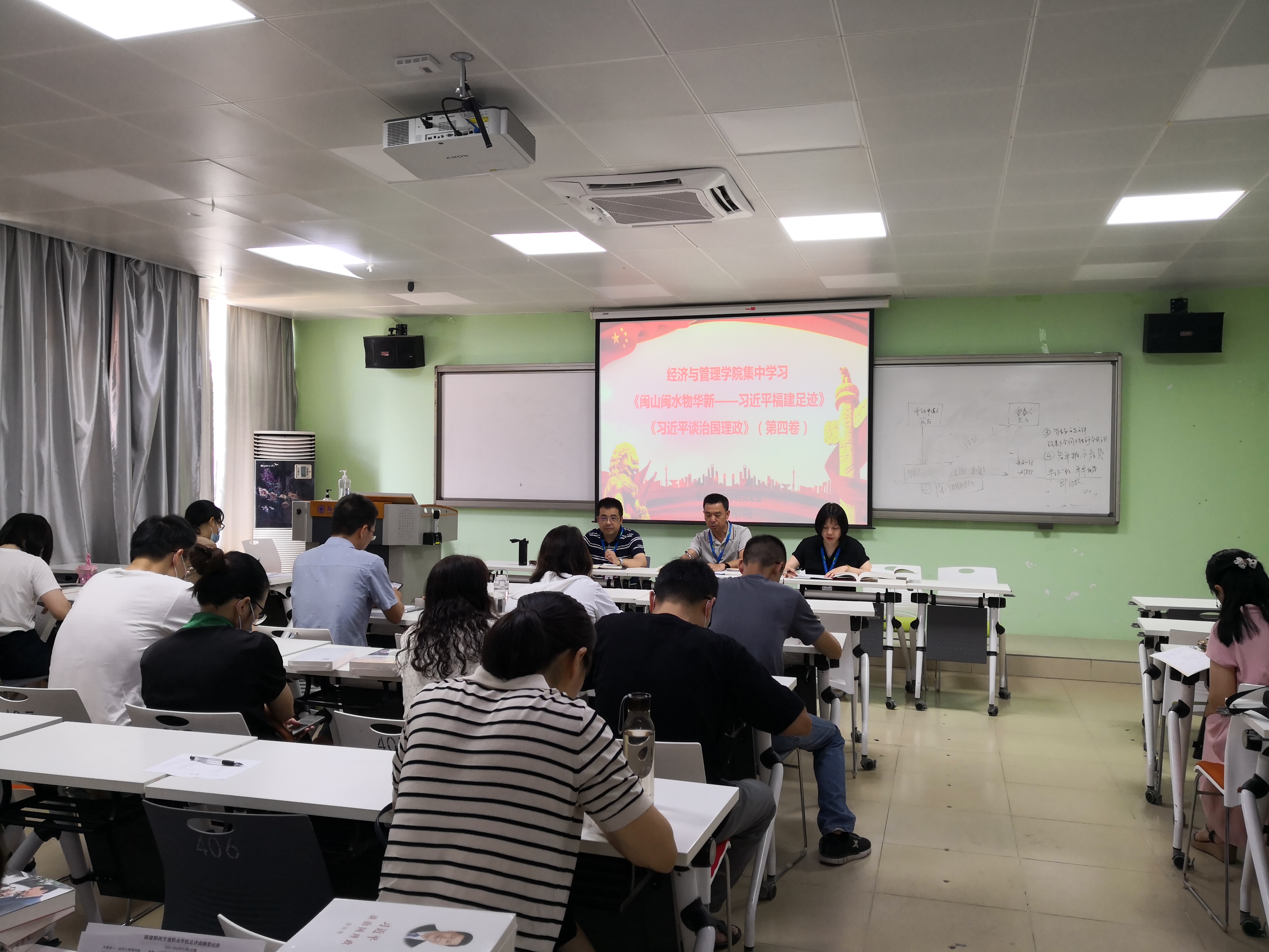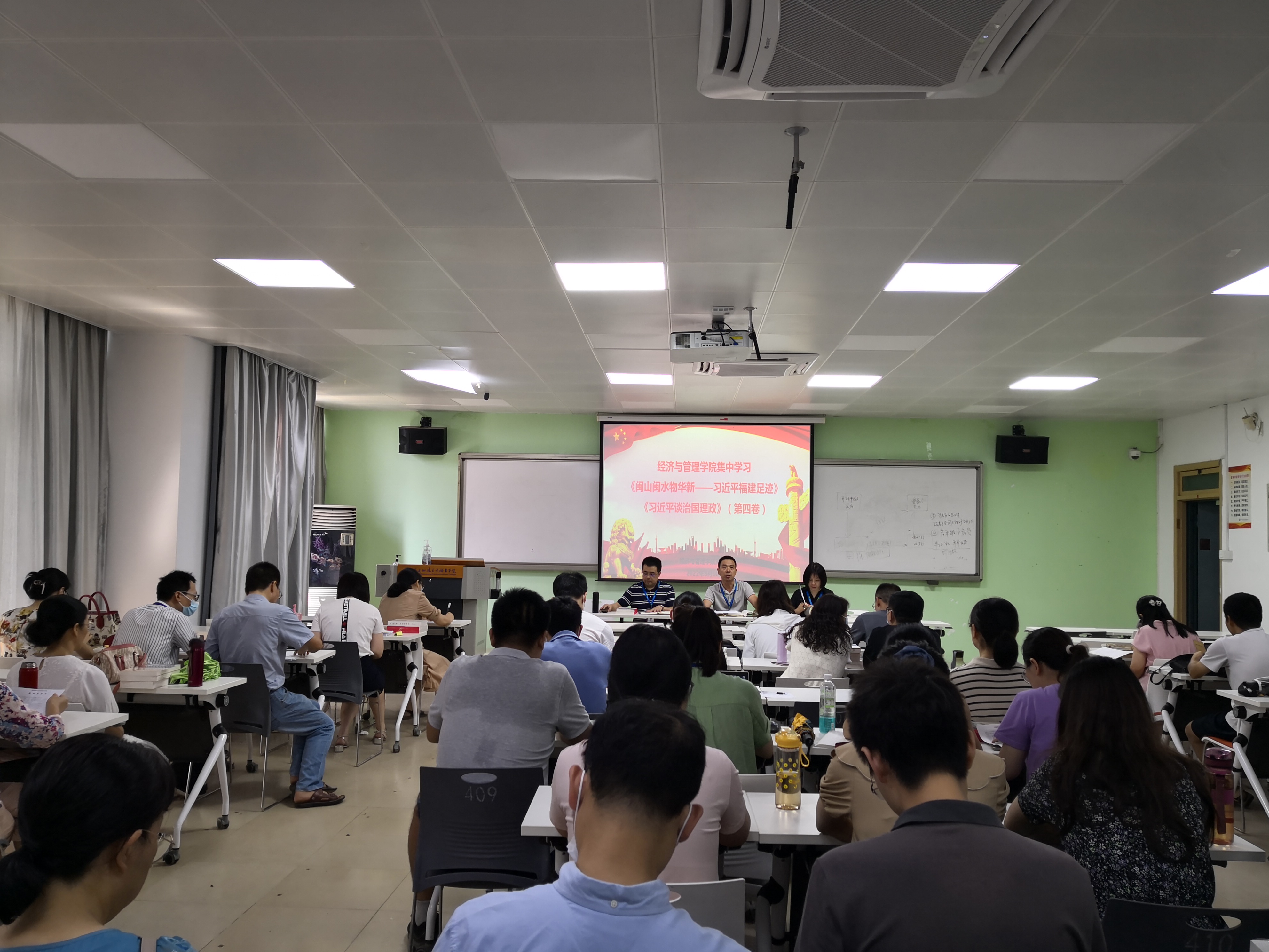 8月16日上午,經(jīng)濟與管理學(xué)院召開全體教職工大會,集中學(xué)習(xí)研討《閩山閩水物華新——習(xí)近平福建足跡》《習(xí)近平談治國理政》(第四卷)。會議由黨總支書記俞素平主持。
