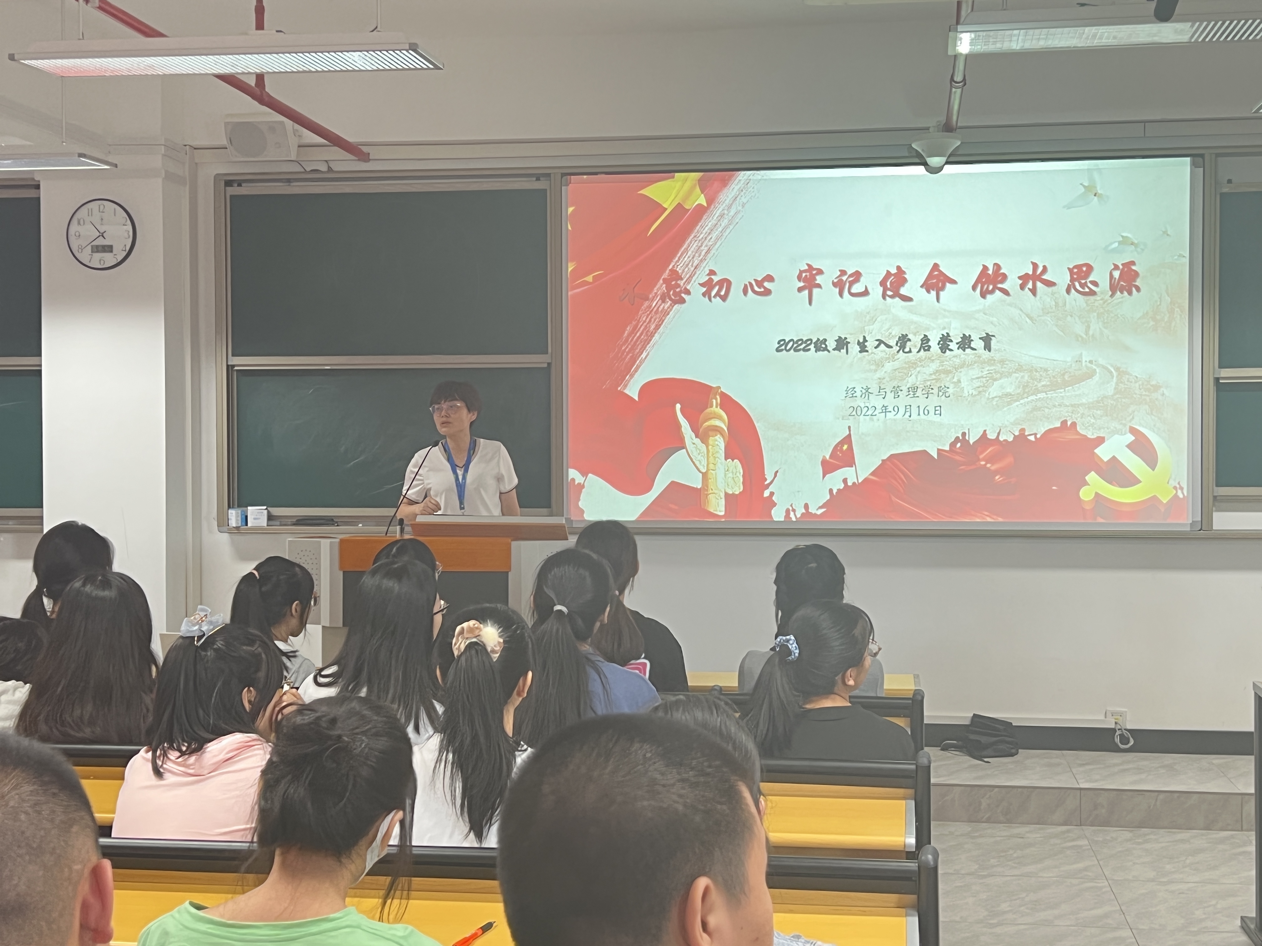 本次活動從觀看“青春向黨”系列短視頻初心篇《你為什么要入黨》開始,讓新生從理論上了解黨,從情感上熱愛黨,從行動上追隨黨。經濟與管理第三黨支部書記吳吉明以“心中有信仰,腳下有力量”為主題給全體新生上黨課,從“入黨為什么”、“為黨干什么”兩個問題出發(fā),告訴新生們在未來的人生旅途中要堅持一顆紅心永向黨,用實際行動傳承和弘揚“建黨精神”,為實現(xiàn)中華民族偉大復興的中國夢貢獻青春力量,以實際行動爭取早日加入中國共產黨。