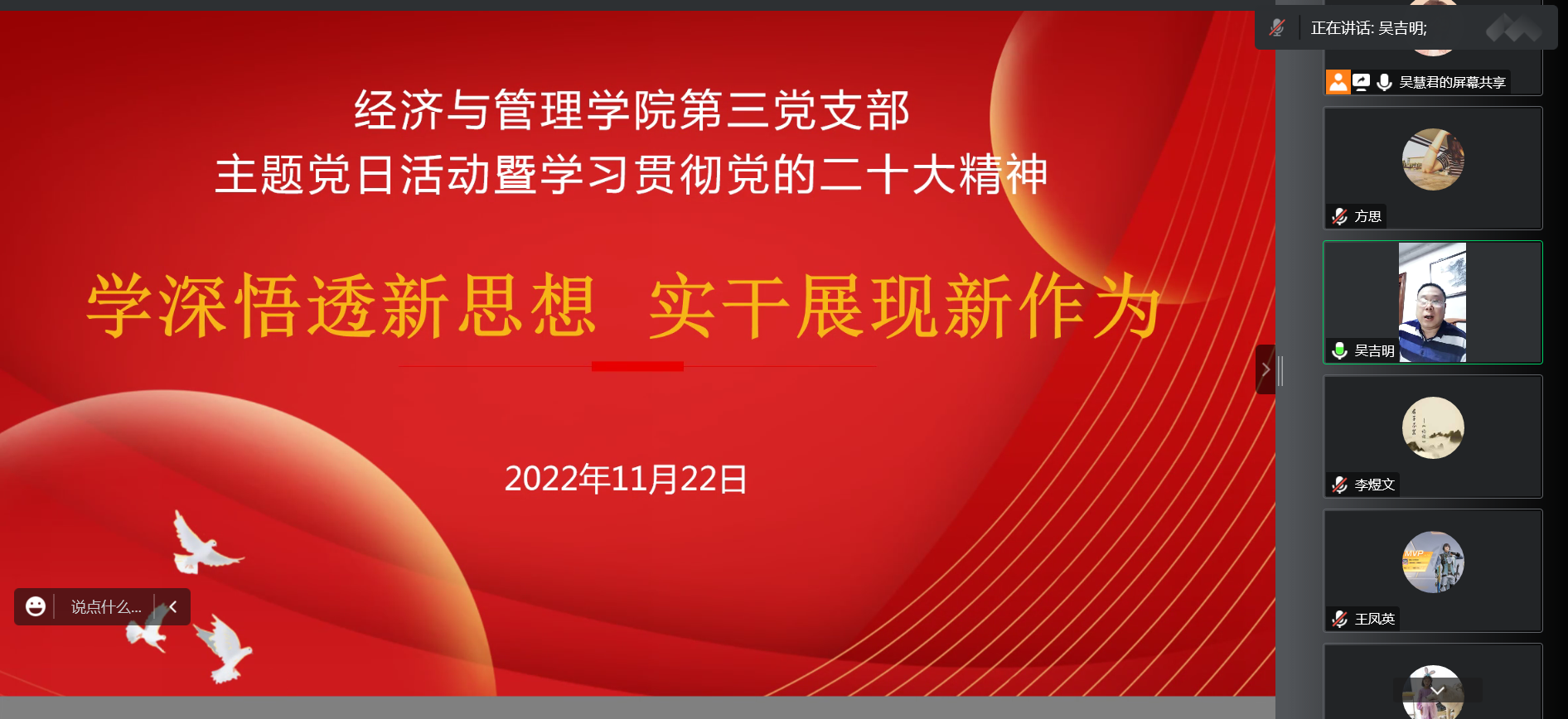 11月22日,經(jīng)濟與管理學院第三黨支部采用騰訊會議的形式開展以“學深悟透新思想實干展現(xiàn)新作為”為主題的黨日活動,傳達學習黨的二十大精神。