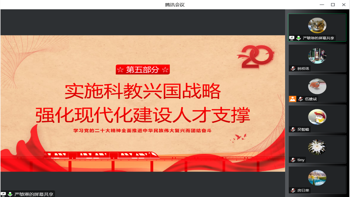 最后,嚴(yán)敏琳同志總結(jié),全體黨員要深刻學(xué)習(xí)領(lǐng)會(huì)黨的二十大報(bào)告中的新觀點(diǎn)、新論斷、新思想、新戰(zhàn)略、新要求,及時(shí)做好總結(jié),切實(shí)把黨的二十大精神貫徹落實(shí)到支部工作、教學(xué)工作、科研工作、班主任工作、防疫工作的全過程中,勇于擔(dān)當(dāng)作為,積極踐行為黨育人、為國育才使命,為科教興國唱響職教強(qiáng)音。