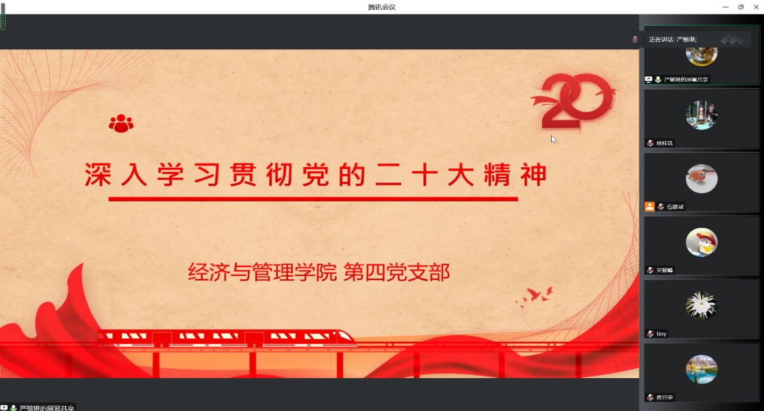 2022年11月25日,由于疫情的影響,經(jīng)濟(jì)與管理學(xué)院第四黨支部以“深入學(xué)習(xí)貫徹黨的二十大精神”為主題,在線上組織學(xué)習(xí)黨的二十大報(bào)告。會(huì)議由支部書記嚴(yán)敏琳同志主持,支部全體黨員參加了此次學(xué)習(xí)。
