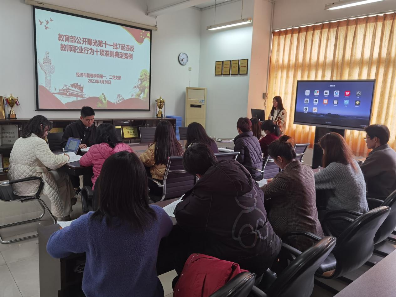 為全面貫徹落實(shí)黨的二十大報(bào)告中提出的“加強(qiáng)師德師風(fēng)建設(shè),培養(yǎng)高素質(zhì)教師隊(duì)伍,弘揚(yáng)尊師重教社會風(fēng)尚”精神,切實(shí)落實(shí)新時(shí)代高校教師“鑄魂育人”使命,增強(qiáng)教師愛崗敬業(yè)、為人師表、以德立教、以德立身的自覺性。2023年3月31日,經(jīng)濟(jì)與管理學(xué)院第一、第二黨支部在31號樓412室開展師德師風(fēng)主題教育與專題研討會。