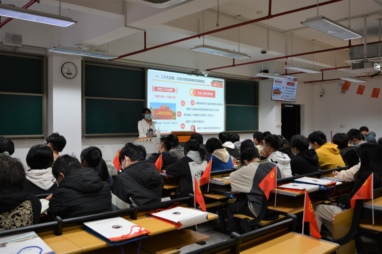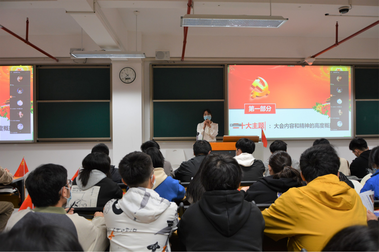 為深入學(xué)習(xí)宣傳貫徹黨的二十大精神,引導(dǎo)青年學(xué)生感悟思想偉力、汲取奮進(jìn)力量, 12月12日下午,經(jīng)濟(jì)與管理學(xué)院第二黨支部書記周秋鶯在實(shí)訓(xùn)樓507教室給22現(xiàn)代物流1班、22市場營銷3班、22關(guān)務(wù)與外貿(mào)服務(wù)3班新生,開展黨的二十大精神專題宣講會。