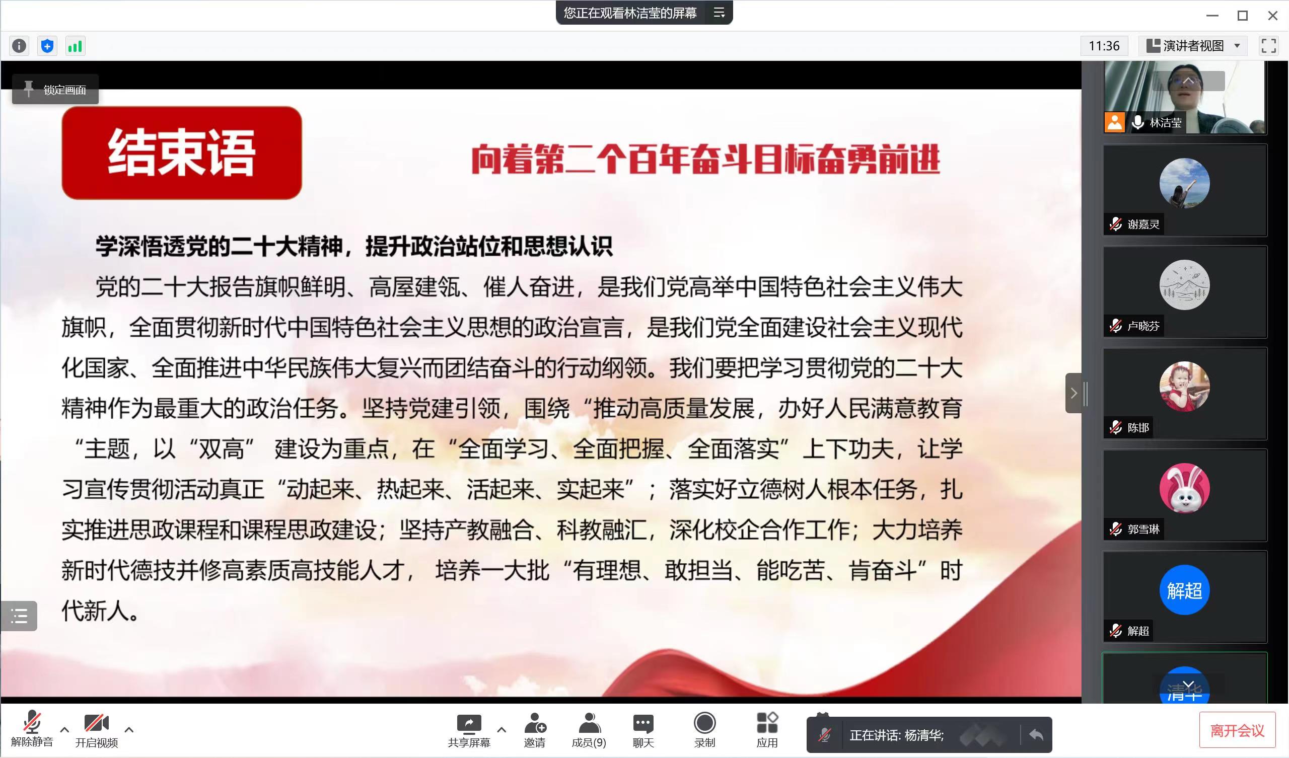 此次專題宣講,圍繞黨的二十大鮮明主題、重大意義、報(bào)告的15個(gè)方面內(nèi)容進(jìn)行解讀,聚焦新論述新論斷,重點(diǎn)對(duì)黨的二十大報(bào)告的“關(guān)鍵詞”進(jìn)行了詳細(xì)闡釋。講授過程緊密結(jié)合國(guó)內(nèi)外形勢(shì),穿插個(gè)人深入思考和現(xiàn)實(shí)案例,深入淺出,主旨鮮明地揭示了報(bào)告精髓和要義。黨課最后,林潔瑩同志強(qiáng)調(diào),全體師生要把學(xué)習(xí)貫徹黨的二十大精神作為當(dāng)前和今后一個(gè)時(shí)期的首要政治任務(wù),在全面學(xué)習(xí)、全面把握、全面落實(shí)上下功夫,學(xué)深悟透,準(zhǔn)確學(xué)習(xí)把握黨的二十大精神核心要義和豐富內(nèi)涵,把學(xué)習(xí)貫徹黨的二十大精神和學(xué)院重點(diǎn)工作結(jié)合起來,以黨的二十大精神為引領(lǐng),立足本職工作,堅(jiān)守培養(yǎng)社會(huì)主義建設(shè)者和接班人的育人本色,在新時(shí)代新征程上為學(xué)院轉(zhuǎn)型發(fā)展作出新的貢獻(xiàn)!