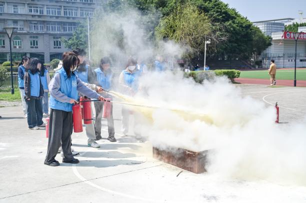 隨后,組織學(xué)生代表在籃球場觀看并學(xué)習(xí)如何使用滅火器。由院自律會成員進(jìn)行滅火使用示范——“提”、“拔”、“握”、“壓”。部分同學(xué)上手嘗試,體會滅火器的使用 。