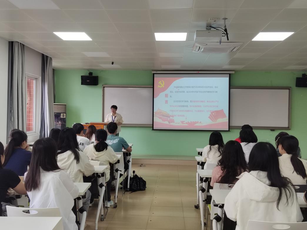 首先,支部書記林麗萍解讀了《關(guān)于在全黨開展黨紀(jì)學(xué)習(xí)教育的通知》,強調(diào)了開展黨紀(jì)學(xué)習(xí)教育的重大意義、目標(biāo)要求和學(xué)習(xí)原則,并帶領(lǐng)同學(xué)們學(xué)習(xí)《中國共產(chǎn)黨紀(jì)律處分條例》的重點內(nèi)容,對各部分新增、修訂的條例進行重點講解;其次,她從講政治、有信念;講規(guī)矩、有紀(jì)律;講道德、有品行三個方面展開,引導(dǎo)青年學(xué)生做一名合格的共產(chǎn)黨員;最后,寄語大家銘記黨員身份,扣好人生第一??圩?,在未來工作崗位上堅守黨員本色、發(fā)揮先鋒模范作用,走好廉潔從業(yè)的人生道路。