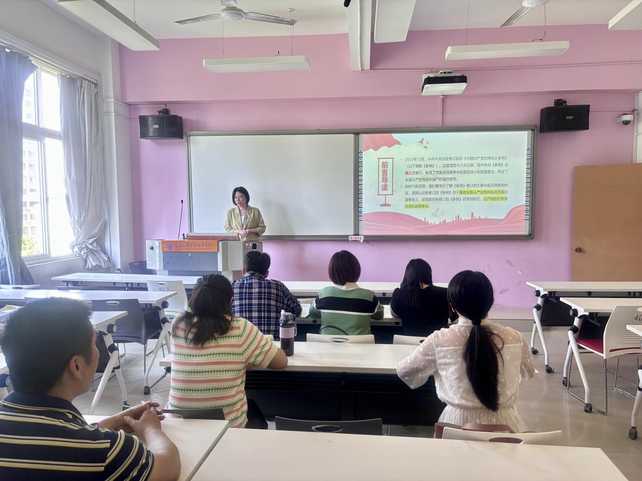 林穎同志圍繞新修訂的《中國(guó)共產(chǎn)黨紀(jì)律處分條例》(以下簡(jiǎn)稱(chēng)《條例》)背景與重要意義、《條例》的主要內(nèi)容、學(xué)習(xí)貫徹《條例》的要求、黨紀(jì)違規(guī)行為及案例分析四個(gè)方面展開(kāi)。林穎同志還緊密?chē)@高職院校的教育定位,并結(jié)合教師工作的實(shí)際情況,提出應(yīng)多方面深挖思政元素,并有機(jī)融入課程教學(xué)。她指出,作為黨員教師,必須堅(jiān)守教育的“底線(xiàn)”,切實(shí)擔(dān)當(dāng)起立德樹(shù)人的重任。