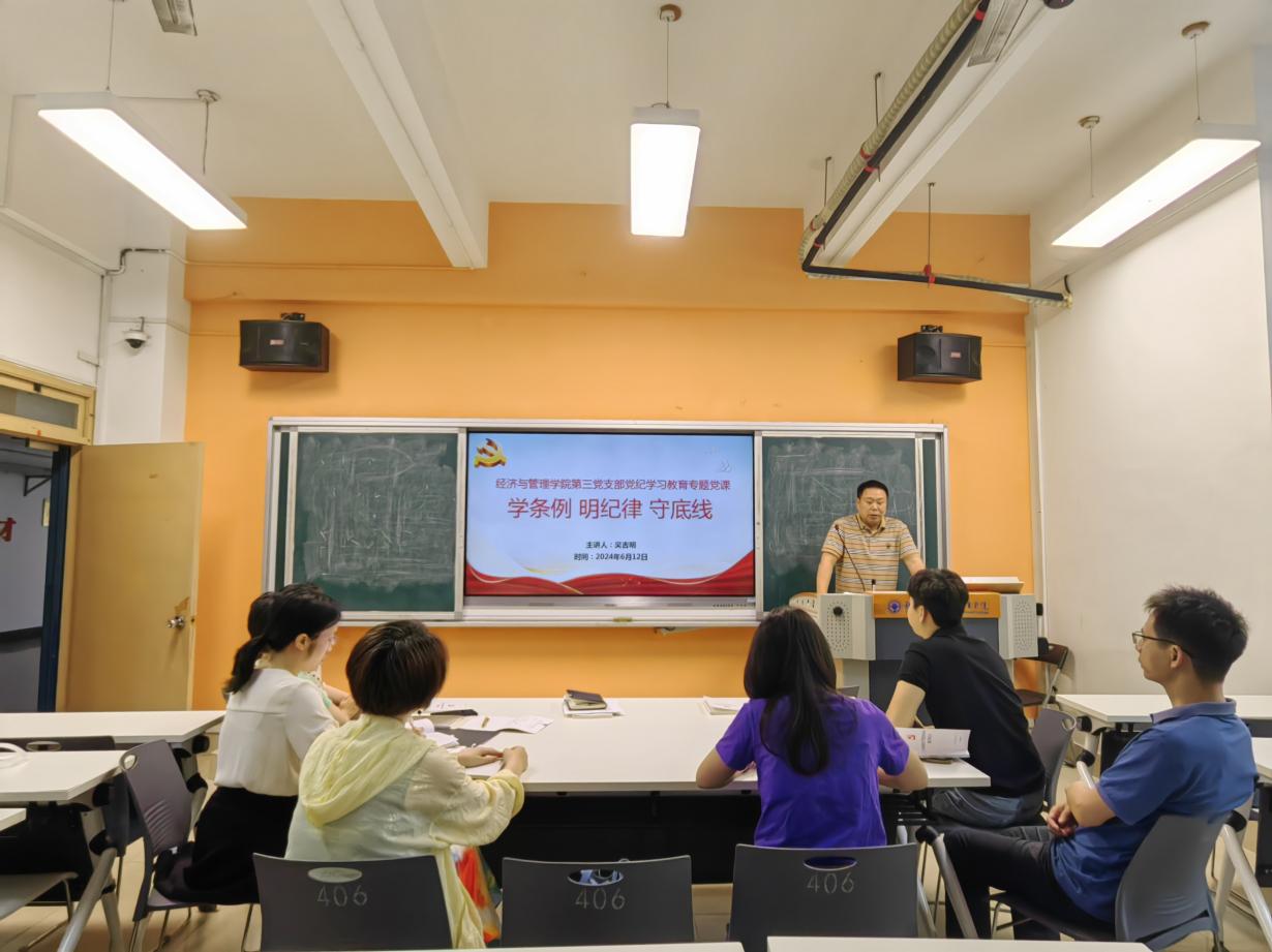 為扎實(shí)開展黨紀(jì)學(xué)習(xí)教育,引導(dǎo)黨員教師們學(xué)紀(jì)、知紀(jì)、明紀(jì)、守紀(jì),2024年6月12日,經(jīng)濟(jì)與管理學(xué)院第三黨支部書記吳吉明以“學(xué)條例 明紀(jì)律 守底線”為題為三支部全體黨員講授黨紀(jì)學(xué)習(xí)教育專題黨課。